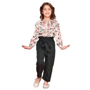 Girls’ Polycotton Floral Print Frilled Top with Trouser Set (Beige & Green)